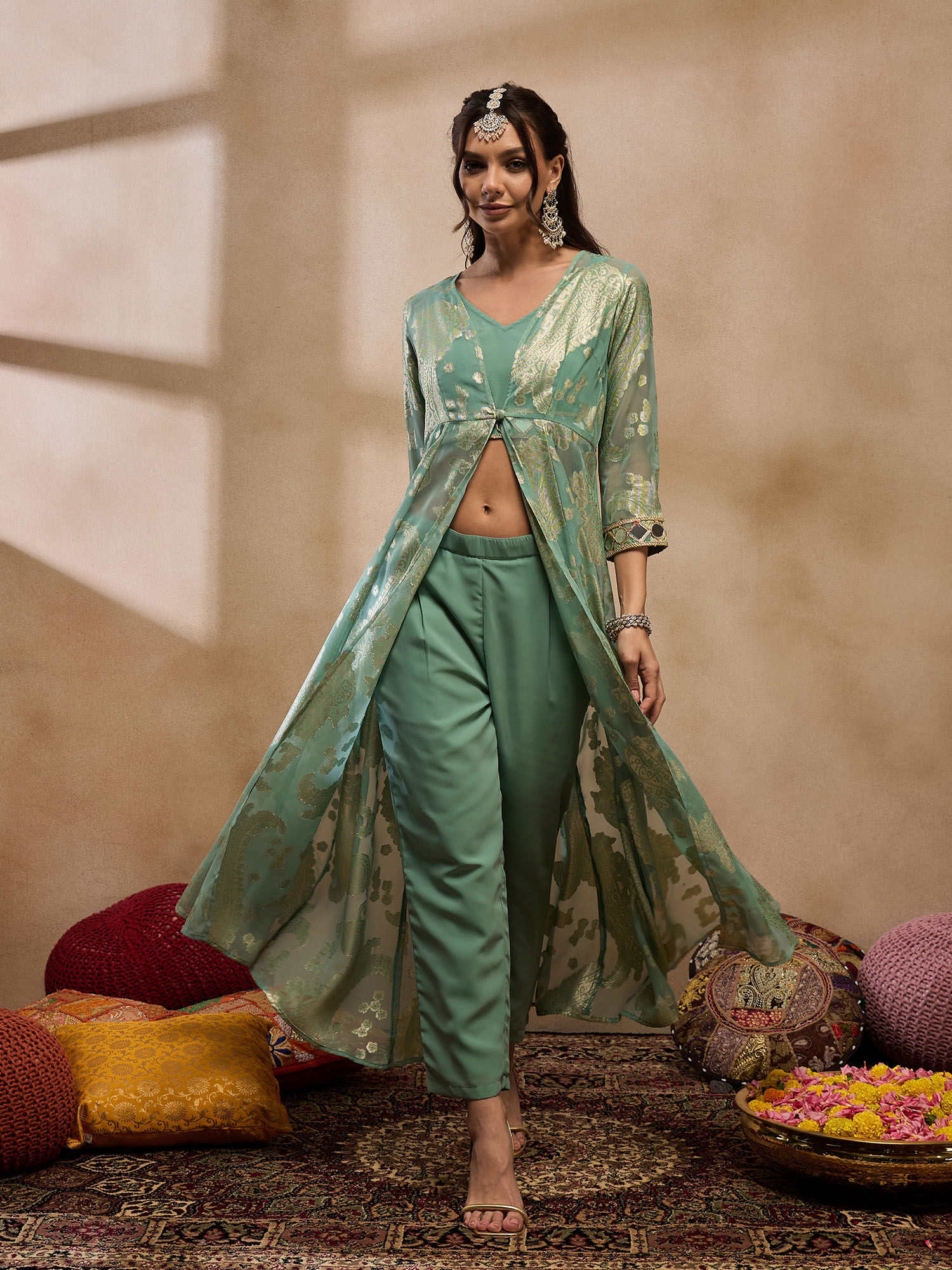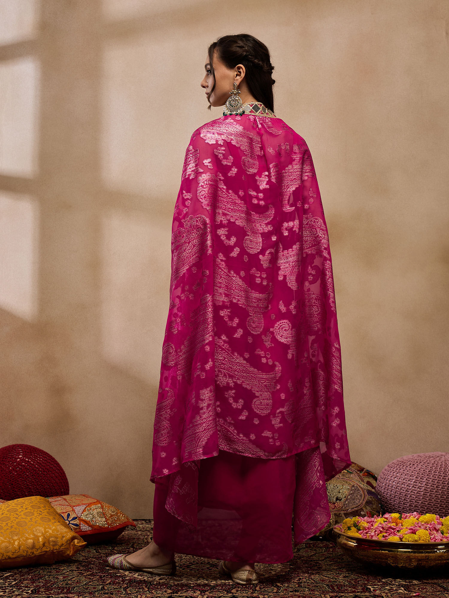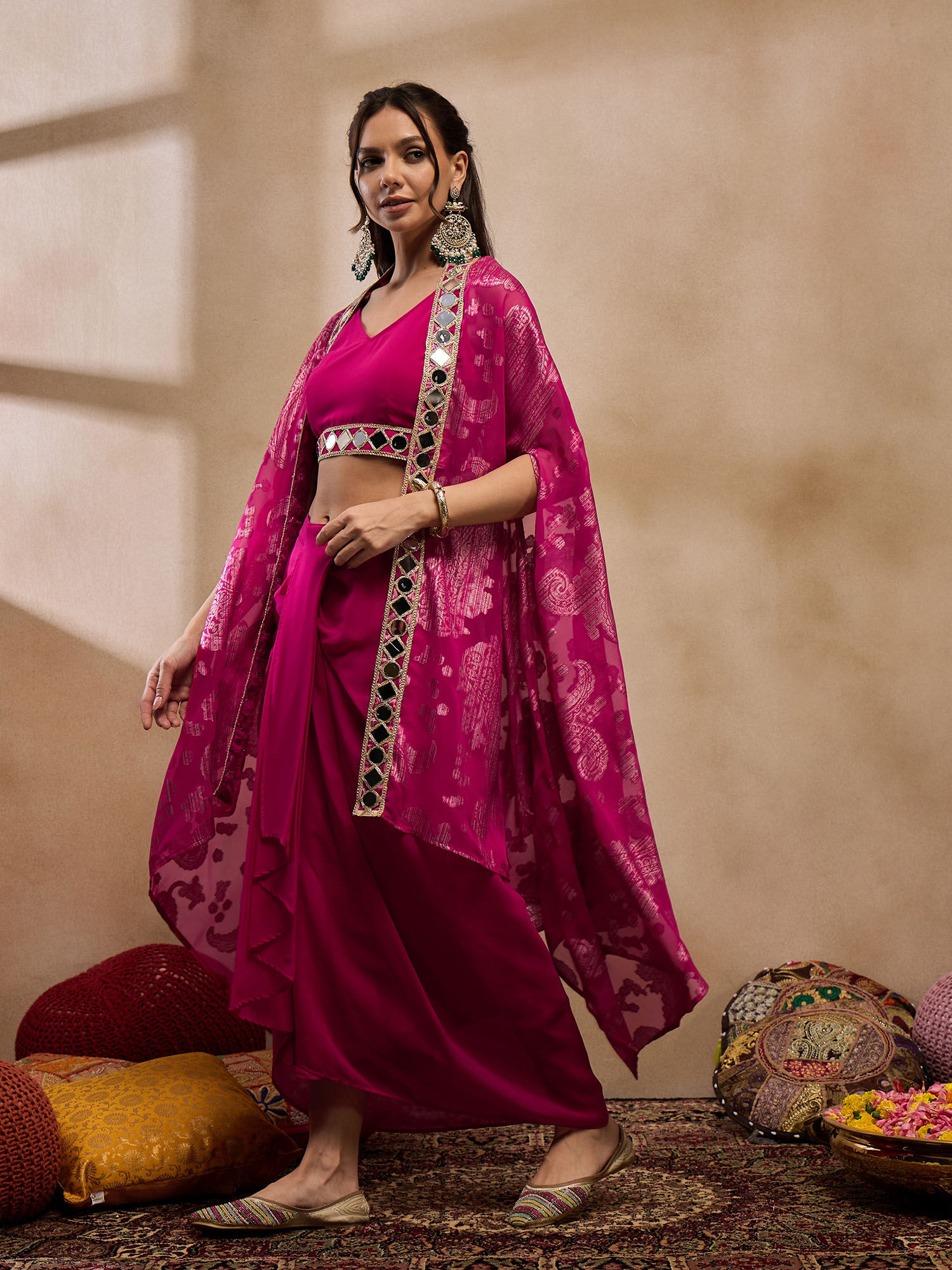 Elevate your style with this pink crop top with cape and pants set from Mabish By Sonal Jain. Crafted from polyester, this gorgeous set is finished with half sleeves and a V-neck. Complete the look with a pair of heels and minimalistic jewellery.